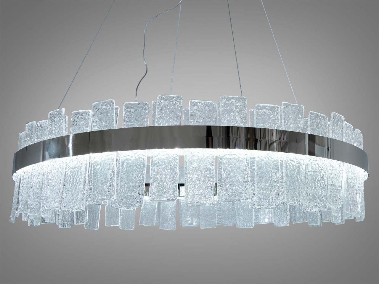 Велика світлодіодна люстра-підвіс з виразним круглим дизайном. Конструкція складається з металевого каркаса кольору хром, прикрашеного рівними рядами кришталевих елементів, що нагадують льодяні брили. Вбудований LED-модуль високої потужності забезпечує яскраве, довговічне та енергоефективне освітлення. Підвішена на тонких тросах, люстра створює враження легкості.