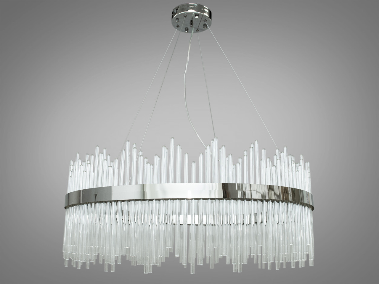 Кругла форма та великий діаметр (80 см) роблять цю люстру помітним акцентом в інтер'єрі. Світло від вбудованих діодів, розташованих у кільці, проходить крізь кришталеві стрижні, заломлюється та створює яскраву гру відблисків. Це наповнює кімнату рівномірним, м'яким та декоративним освітленням.