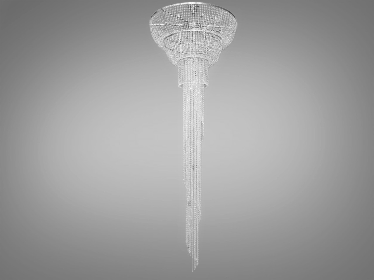 Велика каскадна люстра заввишки 3 метри, дизайн якої створює враження сяючого водоспаду. Конструкція складається з масивного верхнього купола, прикрашеного кришталевими елементами, від якого спадає довгий багатоярусний каскад. Основа кольору хром надає моделі сучасного та вишуканого вигляду. Ця люстра є виразним центральним елементом, призначеним для просторих приміщень з дуже високими стелями.