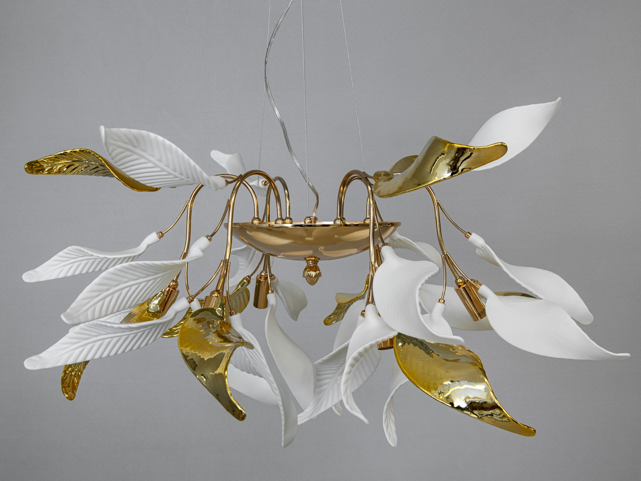 Сучасна підвісна люстра на 6 ламп E14. Каркас золотистого кольору доповнений декоративними елементами з порцеляни (фарфору/кераміки), що імітують природні форми листя. Люстра має діаметр 90 см, що дозволяє їй ефектно виглядати у середніх та великих приміщеннях.