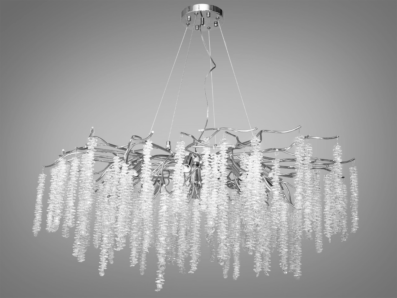 Новинки, люстра на тросах "Гліцинія" від інтернет-магазину "s-svit", є квінтесенцією розкоші та сучасного дизайну, що зливається у гармонійну симфонію світла та мистецтва. Вона ніби виросла з самої природи, хромовані алюмінієві гілки обвиваються навколо, підтримуючи каскади іскристих кришталів, які нагадують квітучу гліцинію, що проливає свої пелюстки у формі чистого світла.