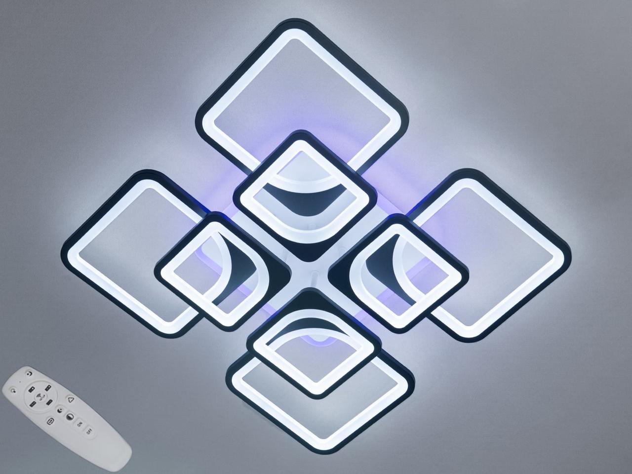 Сучасна функціональна стельова LED люстра з геометричним дизайном (квадратна), виконана в чорному кольорі. Оснащена димером, пультом ДК та кольоровою LED-підсвіткою.