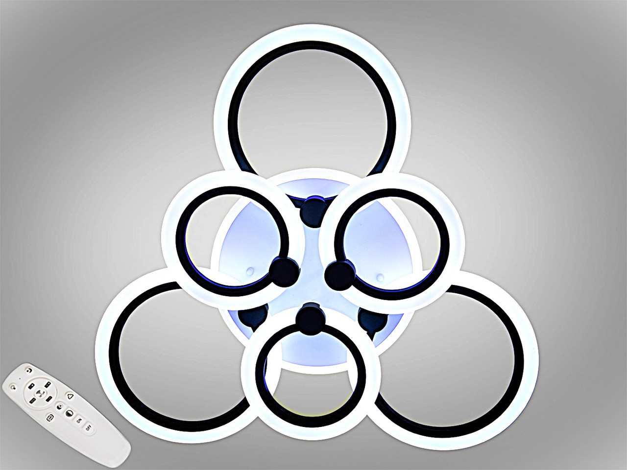 Ця світлодіодна люстра - поєднання геометричної досконалості та високих технологій. Композиція з шести круглих елементів різного діаметра, що переплітаються між собою, створює ефект «космічних орбіт». Чорна матова основа в поєднанні з акриловими розсіювачами робить її ідеальним акцентом для інтер'єрів у стилі хай-тек, лофт або сучасний мінімалізм.