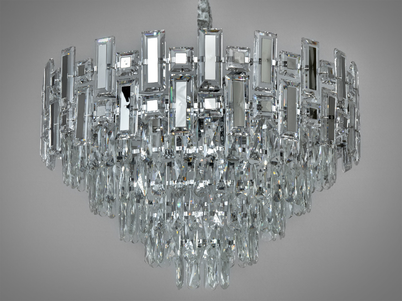 Універсальність стилю: Холодний блиск хрому та класичний кришталь дозволяють люстрі гармонійно вписатися як у сучасний мінімалізм чи хай-тек, так і в розкішну неокласику.